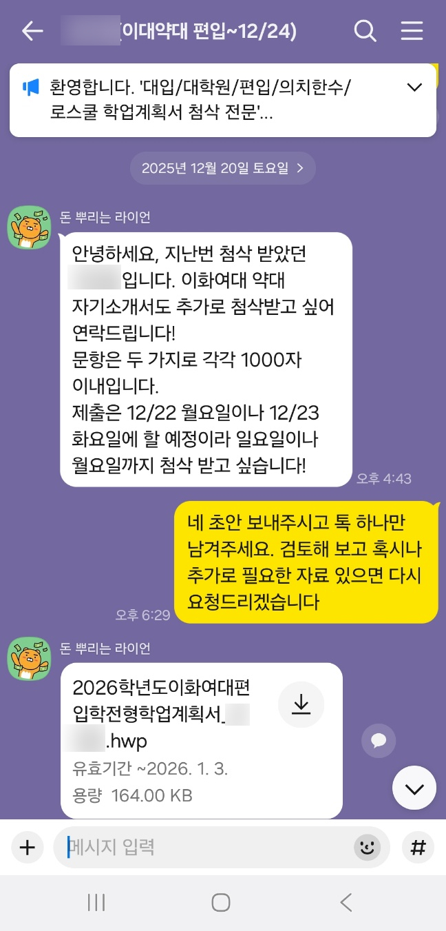 이화여대 편입 학업계획서 첨삭후기