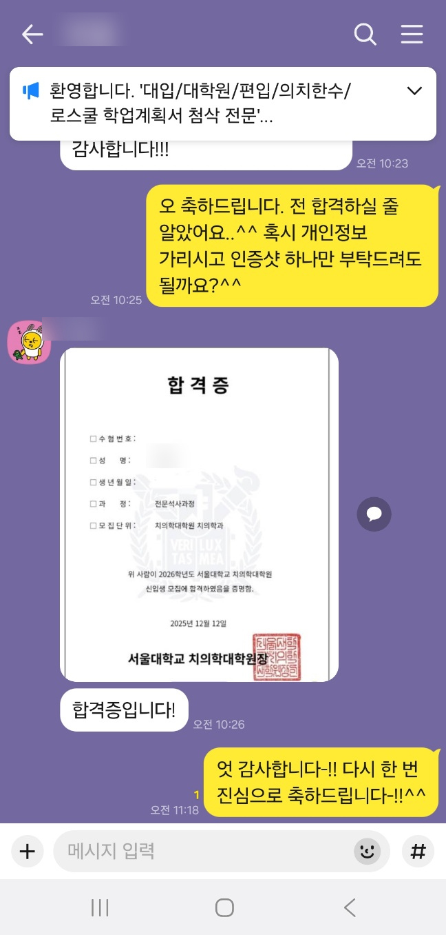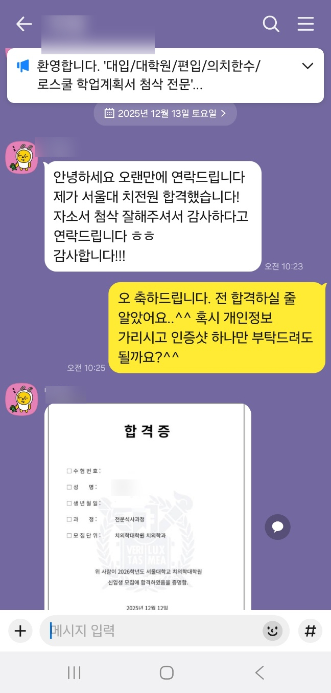 [최종합격] 서울대 치의학전문대학원 자소서 첨삭후기